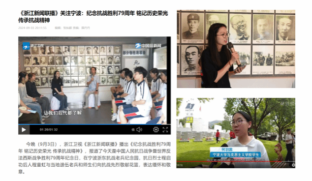 “红扬浙里”暑期社会实践项目。她表示今年是该团队“寻访浙江老革命者”的第六个年头,目前该团队在郑善庆老师的指导下已完成制作《一段隐匿的历史——我的浙东革命》纪录片、出版《抗战回眸——浙东新四军口述史》书册,实现了红色资源、红色课程、红色教学团队环环相扣。这节别样的思政课也被浙江新闻联播、浙江卫视等省级媒体报道。