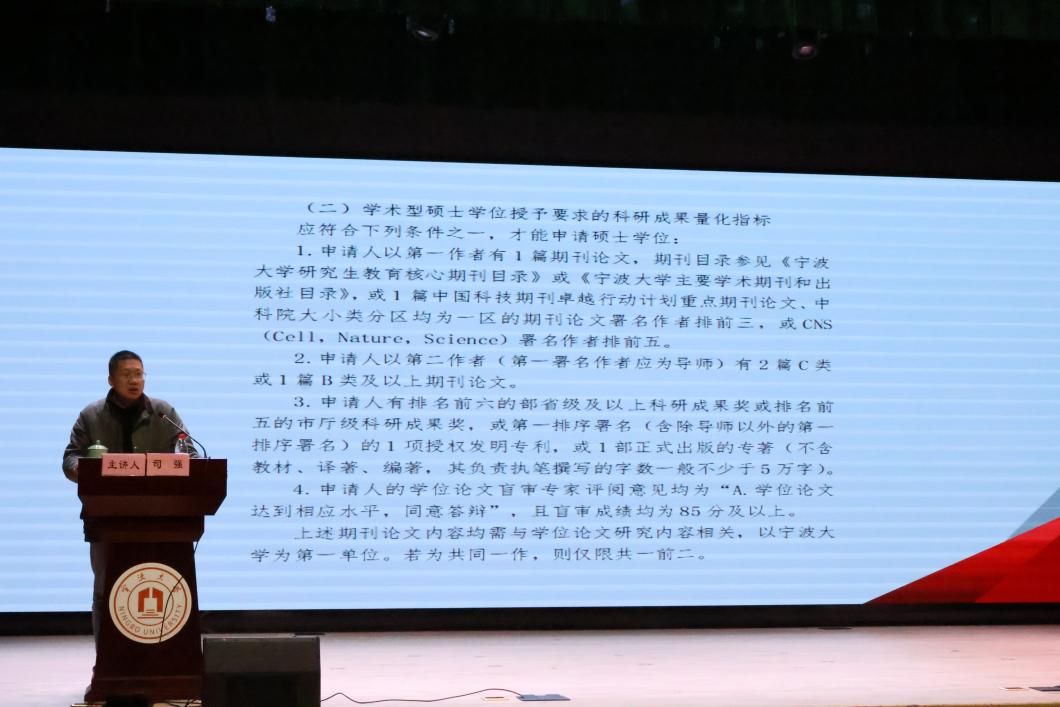 随后,司强针对研究生毕业流程展开详细说明。通过展示学术型硕士学位的科研成果量化标准,他着重强调学术论文的规范撰写与及时发表,同时系统阐释学位论文的评审要求,为与会研究生提供了切实可行的学术指导方案。