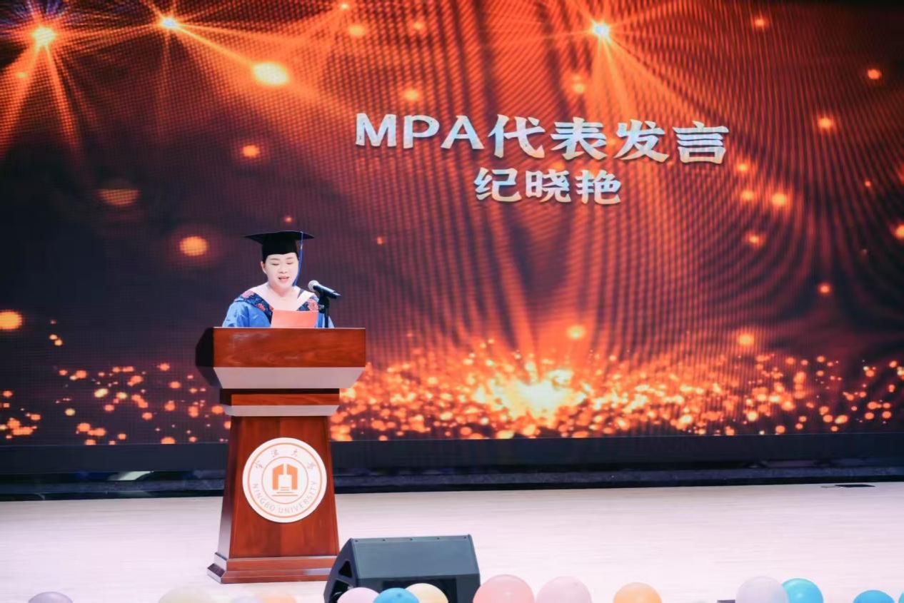 搭建的优质平台,马院用行动诠释了“为学、为事、为人”的统一,为毕业生在成长路上始终有提供了一盏明灯。研究生毕业生代表戴雨雯,分享了三点感悟。一是坚定理想目标,找到成长支点,找到前进的目标与方向,立足于未来的职业规划,向下扎根,方能向上生长;第二勇于接受挑战,打造竞争王牌,人生要多磨练,从而全面发展;第三培养家国情怀,升华人生价值。希望毕业生们以今日为起点,在崭新的人生篇章上、去更广阔的天地间,书写“强国有我”的时代答卷。MPA代表季晓艳发言,她分享了自己在这三年中,肩负着家庭、工作、学习的多重压力,那些挑灯夜读的深夜,都是在工作时间挤出的学习时间,这些都成为了人生中难以忘怀的经历,这些奋斗的日夜,都成为了日后宝贵的财富。