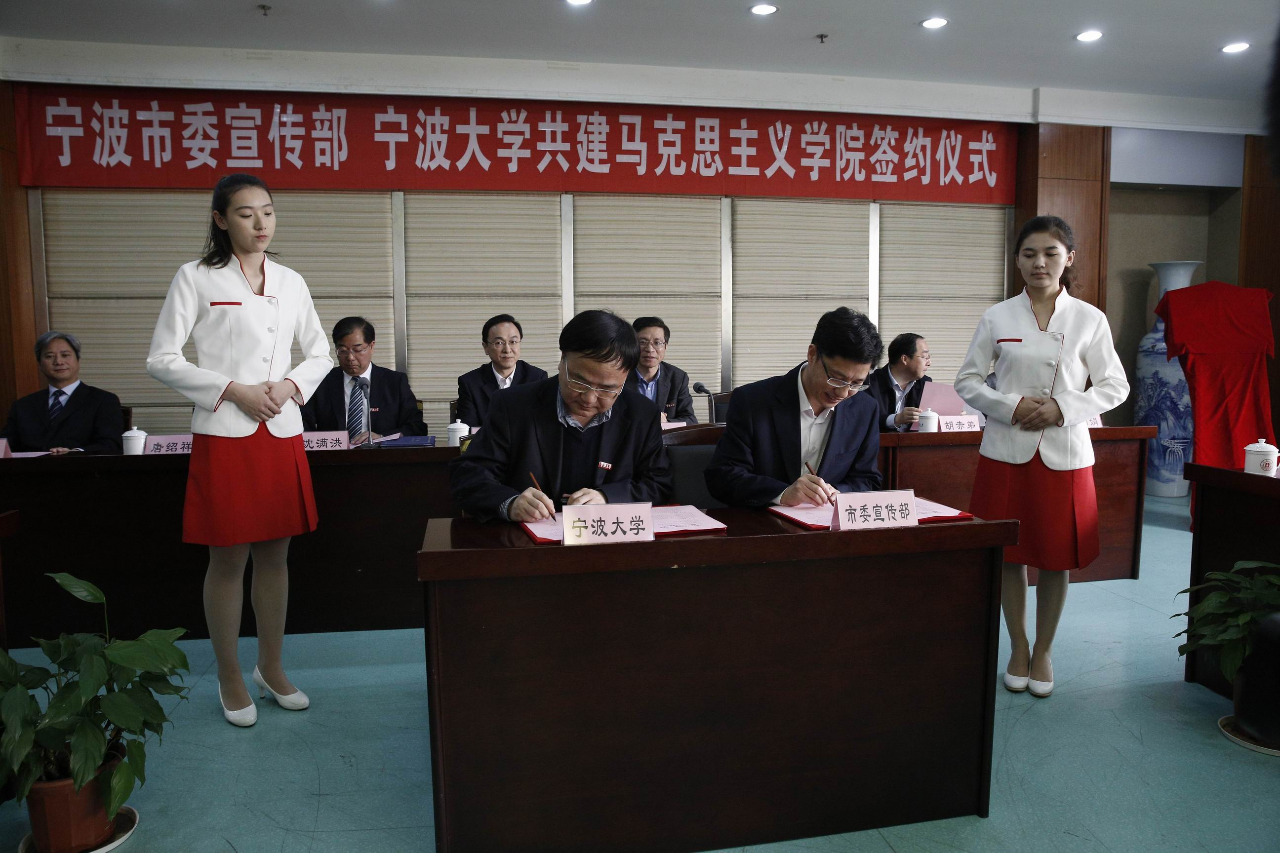 签约仪式上,万亚伟和郭华巍共同为“宁波市中国特色社会主义理论体系研究中心”揭牌。郑丰、唐绍祥签署了共建马克思主义银河娱乐网