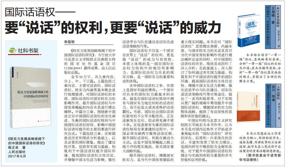院长陈正良教授撰写的著作《软实力发展战略视阈下的中国国际话语权研究》日前在人民出版社出版,宁波日报社高级编辑李磊明特此写了推介文章,刊登于2017年9月28日的《宁波日报》第16版“社科书架”专栏。