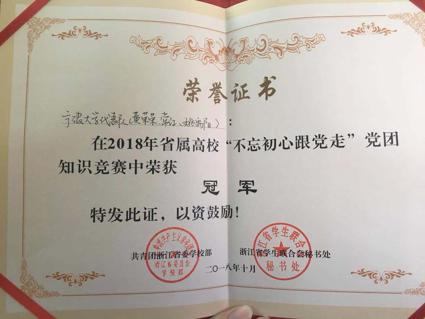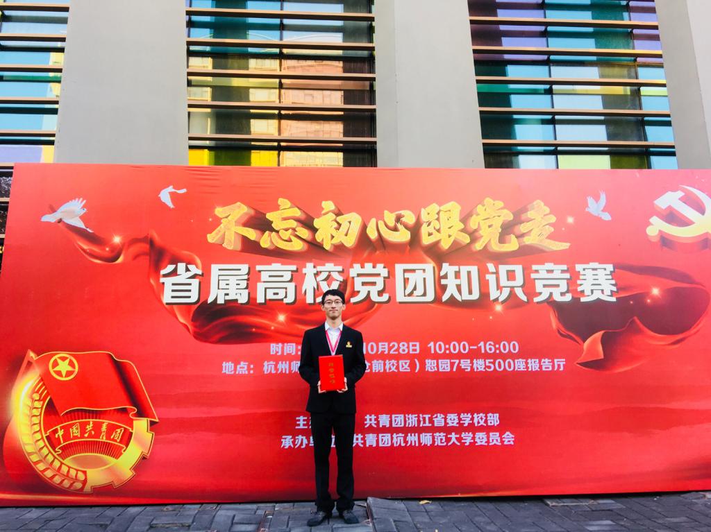 代表队,在“不忘初心跟党走”浙江省属高校党团知识竞赛中,勇夺冠军。此次竞赛在杭州师范大学(仓前校区)举行,共有包括浙江大学、浙江工业大学、浙江师范大学等21支高校组队参加。