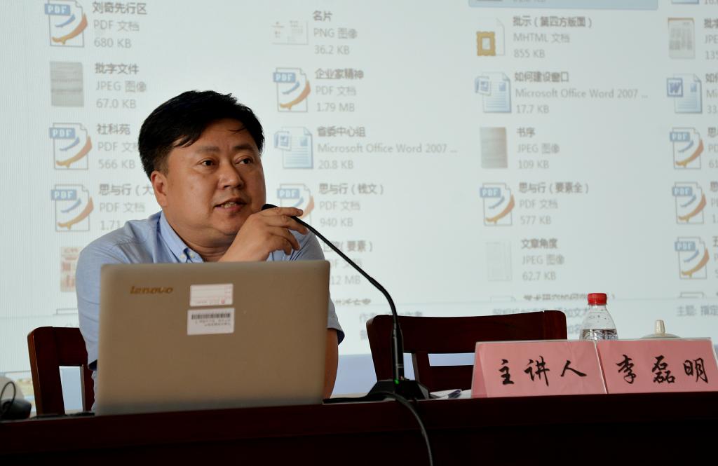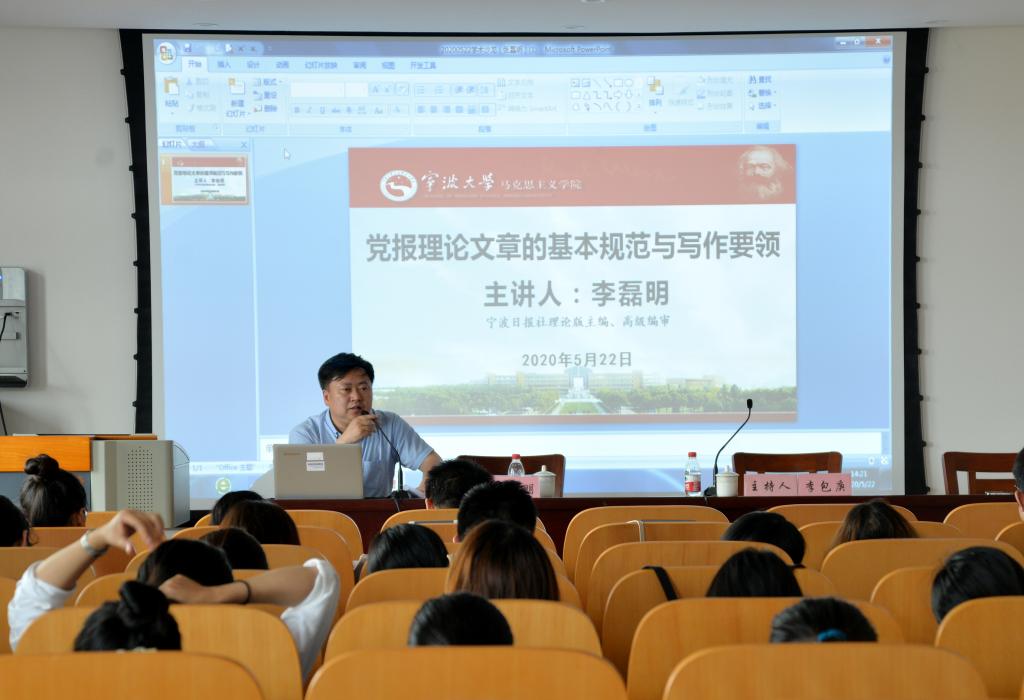 李磊明以宁波日报理论版板块发展历程为切入点,从八个方面指出党报学术论文写作的要点:一是理论导向要准确,坚持马克思主义的指导地位;二是主攻方向要明确,坚持理论为解决现实问题服务的出发点;三是受众的定位需准确,找准核心读者;四是围绕中心,突出重点,找准社会痛点、节点;五是注重特色,精准发力;六是注重时机,预判未来的热点,提高效率;七是既要找点子,也要重思想;八要具备预警作用和纠错功能。同时,李磊明结合自身学术经历对在座的马院师生提出建议:选题要找准可以拓展的学术领域,文章内容要注重学科交叉等。