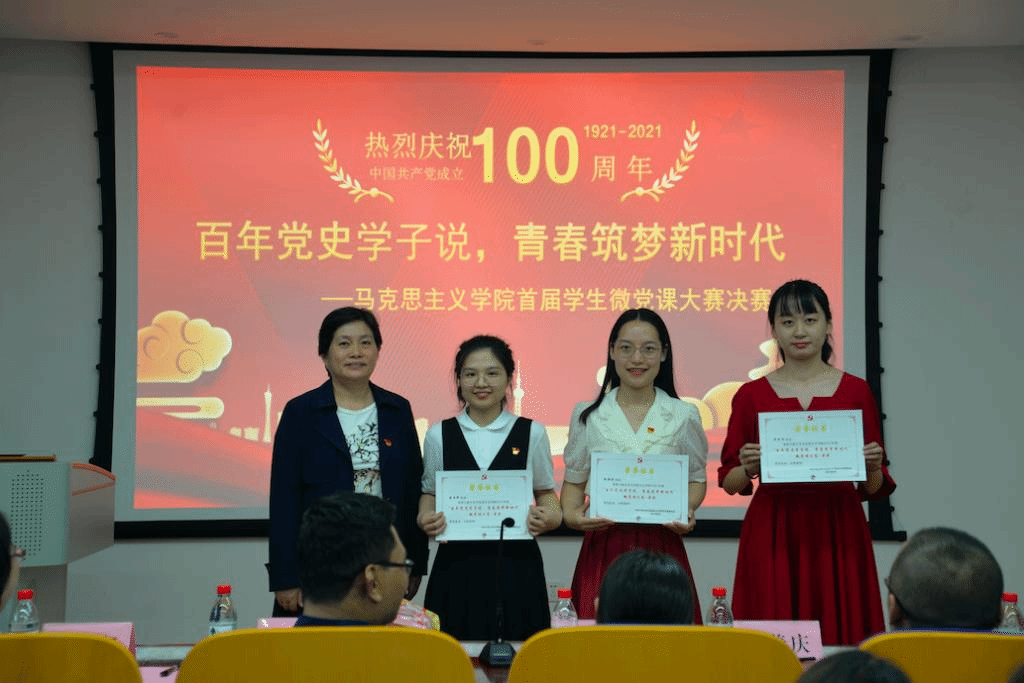 刘友女作总结发言,她对本次微党课比赛的举办表示了极大肯定,对16名参赛学生党员的台风、口才、党课内容、PPT制作等方面给予了高度赞扬,强调在建党百年之际讲好党史的重要性。同时,她提了三点要求:一是希望微党课比赛可以薪火相传,一直办下去;二是希望在讲党课的过程中更加接地气,讲好身边的故事;三是希望党课中注意史实的严谨性,以更专业的水准展示马院学子的风采。刘友女勉励同学们进一步加强理论学习,不断提高自身能力水平,努力打造精品微党课课程,使马院的学生党员讲微党课成为亮丽的党建工作品牌。