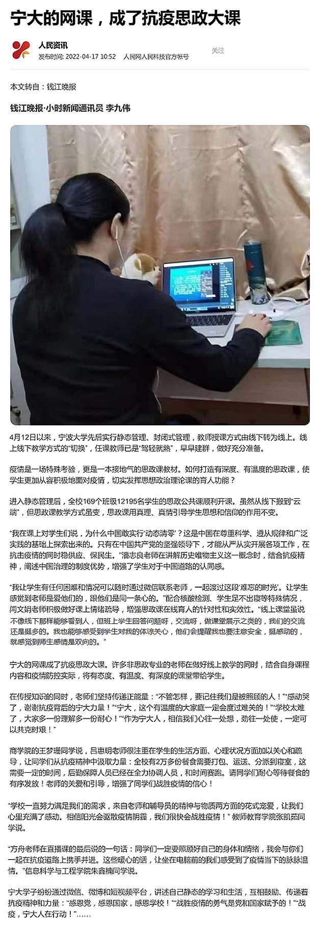 如何打造有深度、有温度的思政课,使学生能够更加从容积极地面对疫情?马克思主义银河娱乐网 如何切实发挥思想政治理论课的育人功能?4月17日的钱江晚报对银河娱乐网 抗疫思政云课堂作了报道……