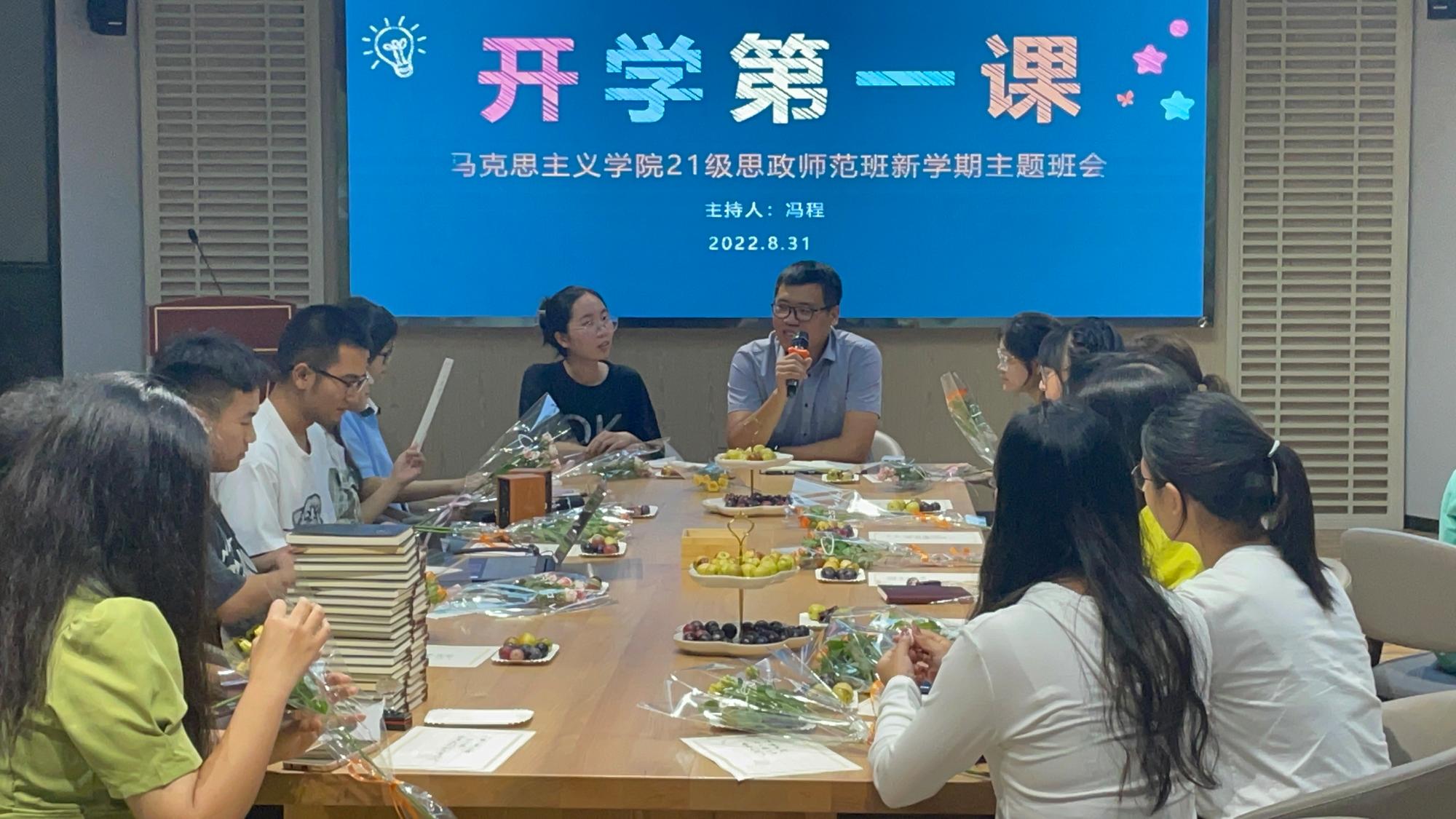 在欢快的背景音乐中,学生们依次作自我介绍。随后,班主任和辅导员作深情寄语。此次“开学第一课”主题班会还将8月31日设为了21级思政教育(师范)班的班级集体生日,现场师生在轻松愉快的氛围里,共同分享了这份属于班集体的喜悦。此外,“开学第一课”还特别邀请了马院优秀校友——中央党校在读博士刘云霞和省优毕业生、研究生支教团优秀志愿者王一峰为新同学分别做了如何做好升学、考公、考编和如何规划精彩的大学生活的主题分享,在场同学纷纷表示收获满满。