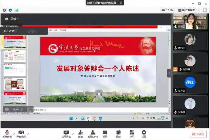 党总支在线上如期举行了党员发展答辩会。答辩会由专职组织员吴莲红老师主持,党总支委员司强副教授、院团委书记杨曼、学生党建辅导员赵怡楠、全体学生党员和入党积极分子共计157人参加了会议。