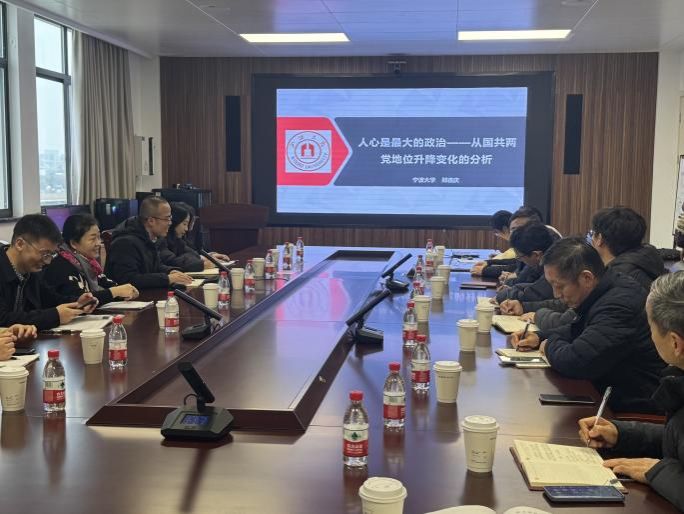 思想政治教育教师党支部书记郑善庆为在场党员讲授主题党课“人心是最大的政治——从国共两党地位升降变化的分析”,他从“浙东革命者口述访谈”活动讲起,结合他组织学生团队访谈浙东地区多位百岁党员及其后代,收集到许多文献记载中未能提及的珍贵党史故事,进一步讲述抗战时期共产党员艰辛的革命历史。所谓人心是最大的政治,他从国共两党兴衰的历史维度为切入点,对浙东革命根据地进行深入分析,通过正反对比,突出中国共产党具有良好的群众基础,更加注重广大人民群众的利益,为群众所颂扬。他总结道,中国共产党的崛起并不是偶然的,而是有其必然性。中国共产党在革命时期吸引众多年轻人参加,聚集了大批专家学者,实现了知识分子与工农群众的结合,并通过延安整风运动等,实现了思想和行动的统一。