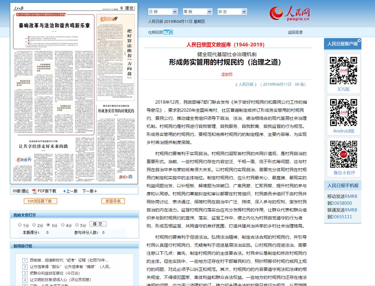 孟献丽教授的文章《健全现代基层社会治理机制,形成务实管用的村规民约》在《人民日报》第九版理论版刊载,这是银河娱乐网
