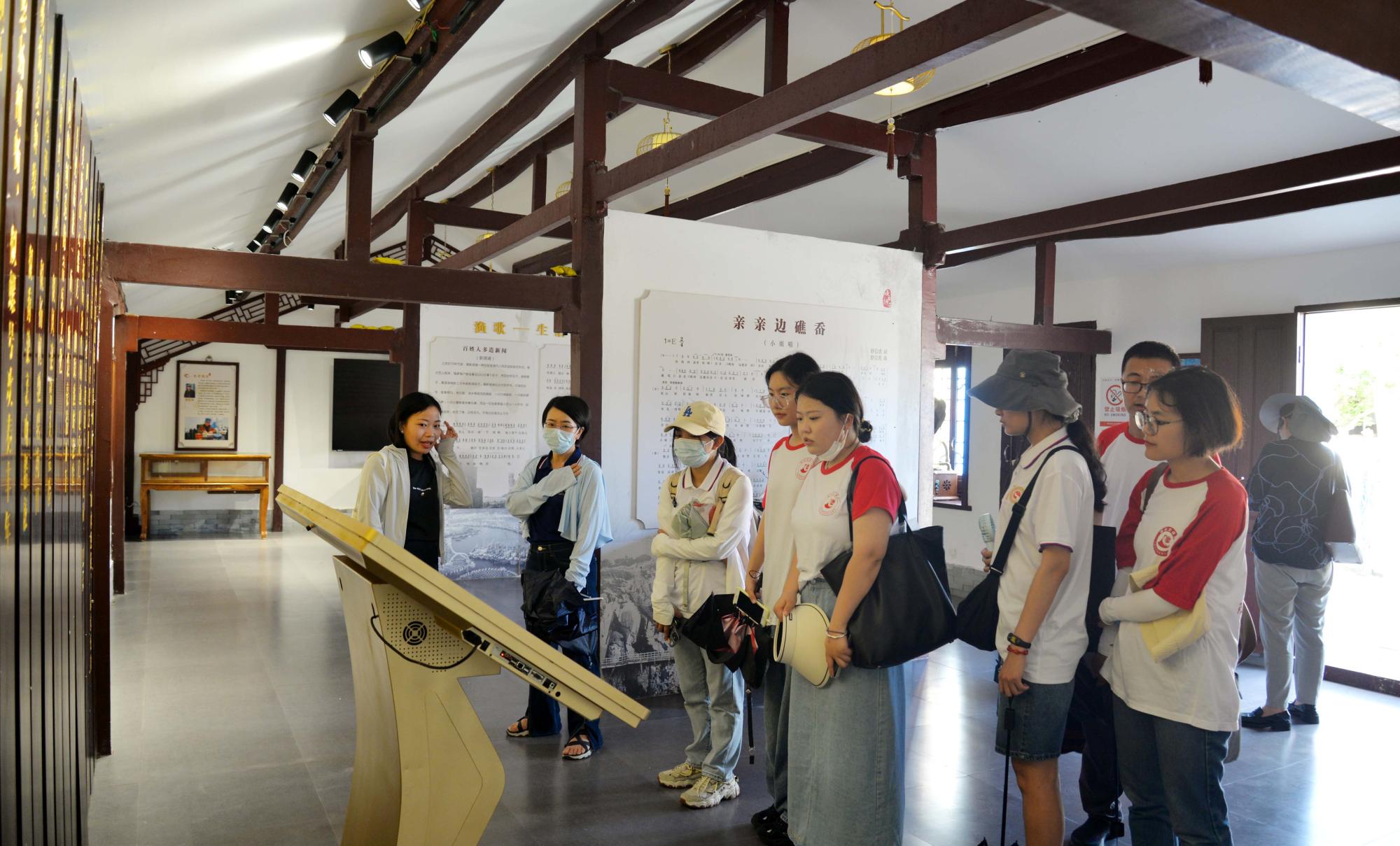 在美丽乡村共富建设中,党建又发挥了怎样的作用呢?在县委宣传部江淑维科长的陪同下,师生们深入五龙乡边礁村、黄沙村和田岙村等渔村,了解基层党建引领下的乡村振兴建设成果。五龙乡相关负责人带领师生们参观了边礁村孙大姐知心工作室、阿鲍道地会、渔歌号子馆等充满渔村风情的基层党建特色打卡点,感受基层党员的示范引领力量,领略“党建+”的独特魅力;参观了黄沙村新时代文明实践站、村史馆和渔火剧本杀馆,学习红色文化与新兴产业相结合的新模式;在田岙村参观嵊泗抗战纪念馆、渔民画创意体验馆,体会渔农村文化品牌从资源形成到资产转化,释放出共富共美的新活力。五龙乡以村庄为点,红色党建和绿色生态为线,全面打造模式融合、内容融合的党建研学游专项路线,把基层党建、法治建设融入基层社会治理、乡村振兴发展中,推动文旅深度发展。在推进共同富裕过程中,渔村各具特色的人文之美、生态之美和和谐之美,为浙江共同富裕示范区建设提供了范例。