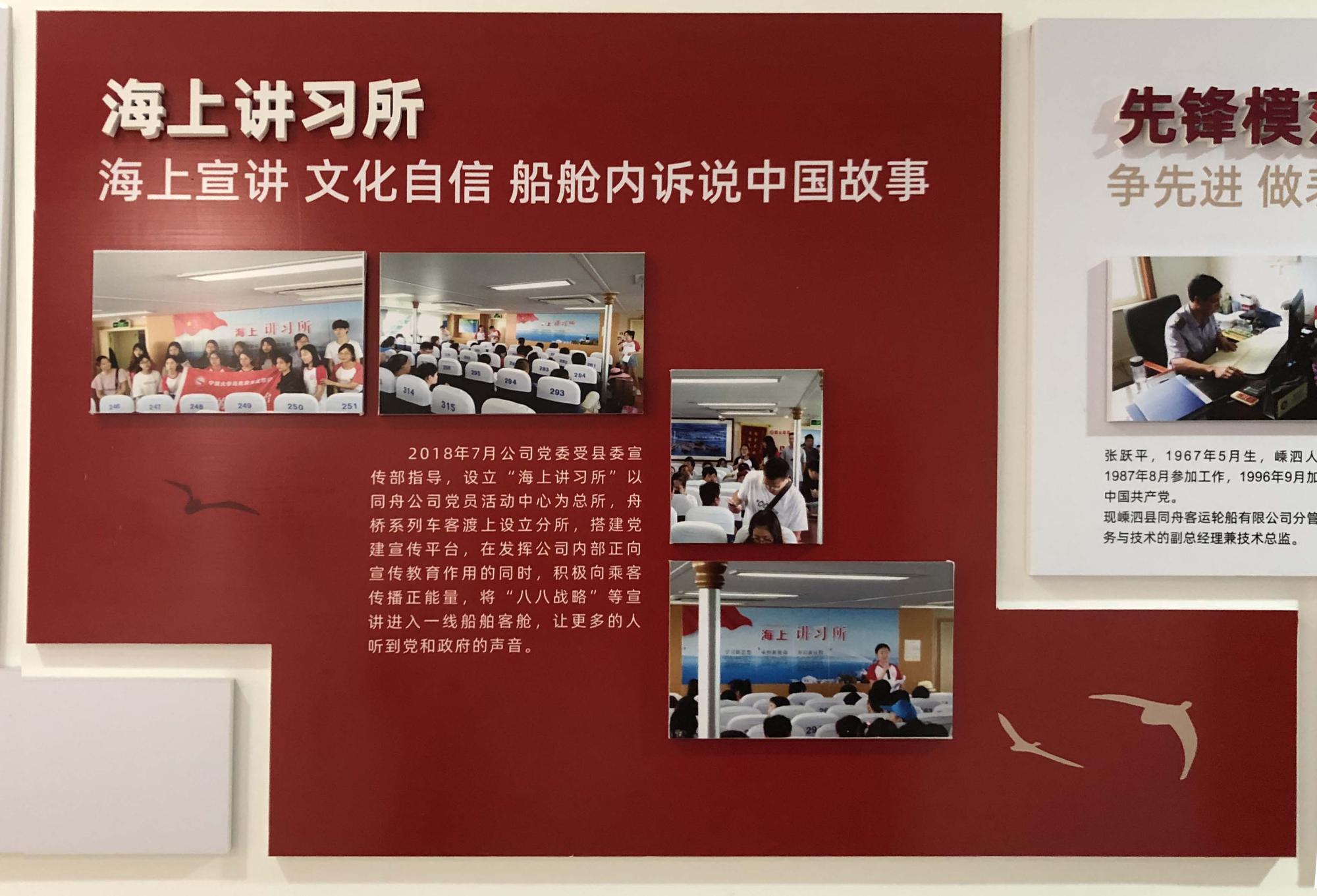 企业党建工作开展得有声有色。在嵊泗县交投公司,支部委员小张带领师生们一起参观了公司的文化长廊、党群活动室等场所,介绍了通过党建引领促发展,公司员工同心同向同行、奋发向上的工作环境。师生们惊喜地发现,文化墙上挂着宁大马院学生理论宣讲团宣讲的照片。小张介绍说,“这是公司的‘海上讲习所’平台,公司与宁大马院合作开展活动,在客轮行进过程中开展党史学习教育,使红色文化与红帆船工作有机结合。”如今,“海上讲习所”已成为交投公司一张靓丽的“党建名片”。师生们还了解到全国劳模张跃平积极发挥党员的榜样力量和先进模范作用,通过工作室的“红色技术团队”形式为公司培养了大批人才,也为嵊泗县的人才工作做出了贡献。