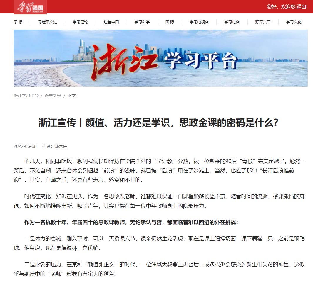 6月9日,“学习强国”平台发表银河娱乐网 郑善庆副教授撰写的文章《颜值、活力还是学识,思政金课的密码是什么?》。文章认为,“思政课的本质是讲道理”,培根铸魂、立德树人,乃是其最终目标;作为一名思政课教师,唯有寸积铢累、久久为功,方能推陈出新、行稳致远。文章全文如下: