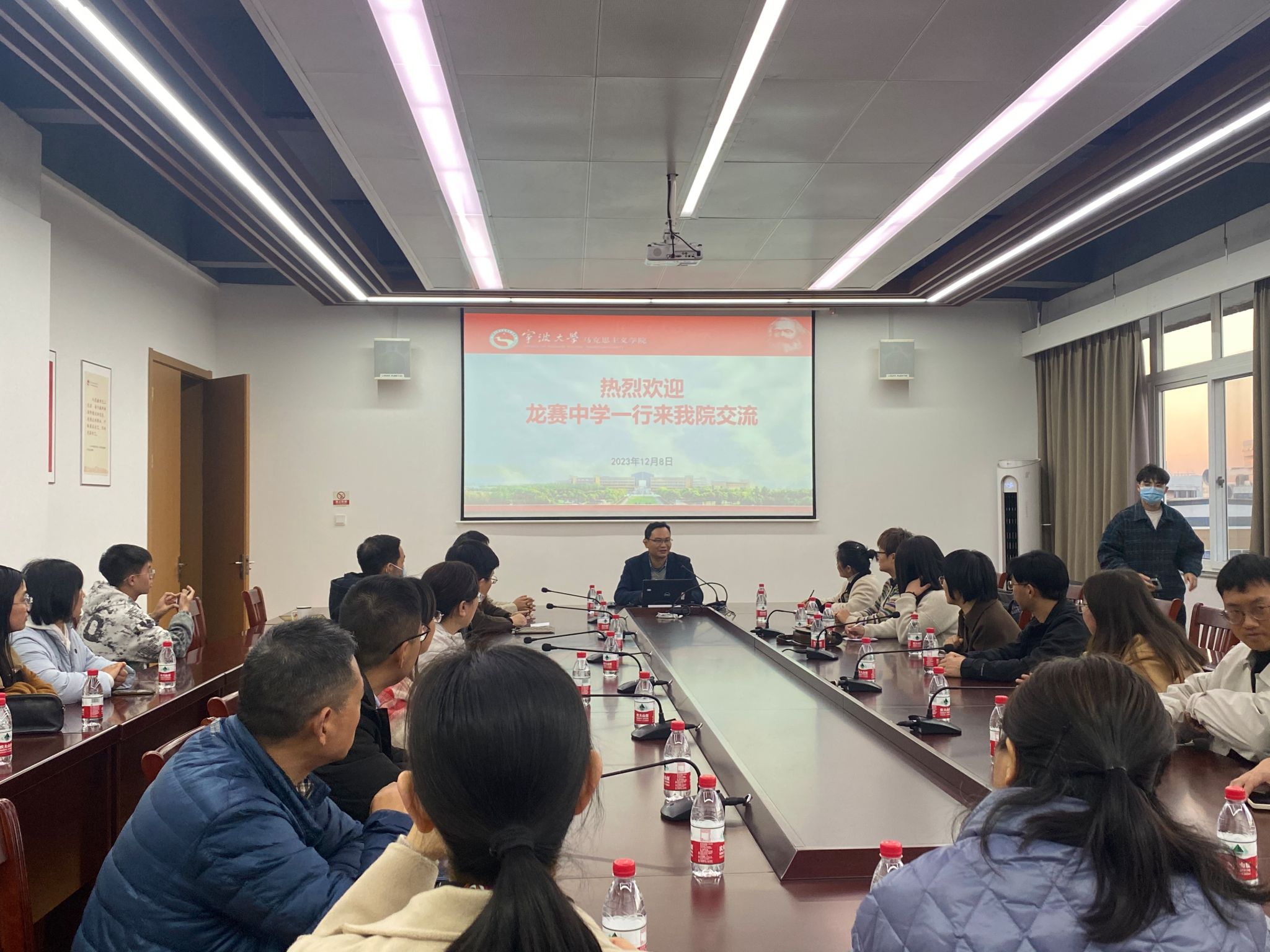 12月8日下午,镇海龙赛中学政治组等一行40余人来银河娱乐网 进行交流研讨。副院长刘举出席并讲话。思想政治教育系主任于丽丽老师及张小芳老师参加了会议。