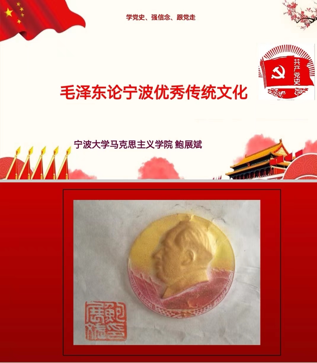鲍展斌首先作“毛泽东论宁波优秀传统文化”的主题党课。他围绕浙东学术文化、宁波商帮文化、宁波中医药发展历史、宁波《红楼梦》文化等方面内容,深入阐释了宁波优秀传统文化的内涵,讲述了毛泽东与宁波优秀传统文化的不解之缘。