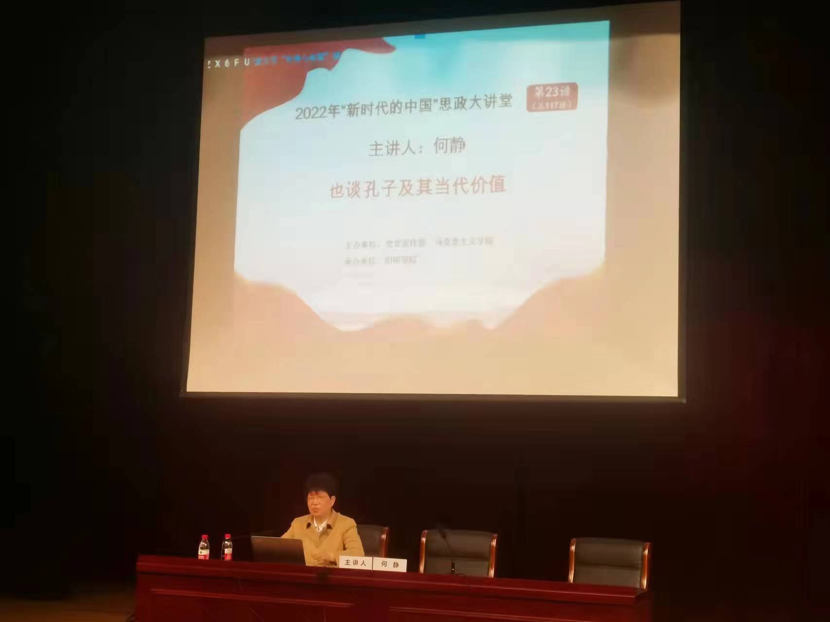 6月1日晚,马克思主义银河娱乐网 何静教授在银河娱乐网 北区忻元甫报告厅为阳明银河娱乐网 学生作题为《也谈孔子及其当代价值》的“形势与政策”课。