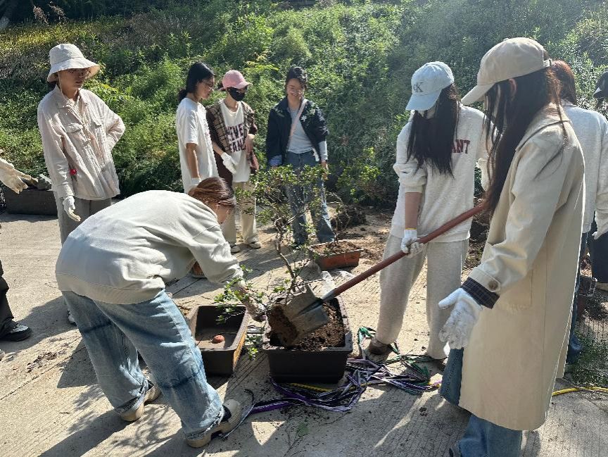 经过前面的参观环节,最后同学们进入来到盆景装饰修建区进行动手实践。在这里,同学们三人一组,分工协作,开启了充满创意的盆景制作之旅。