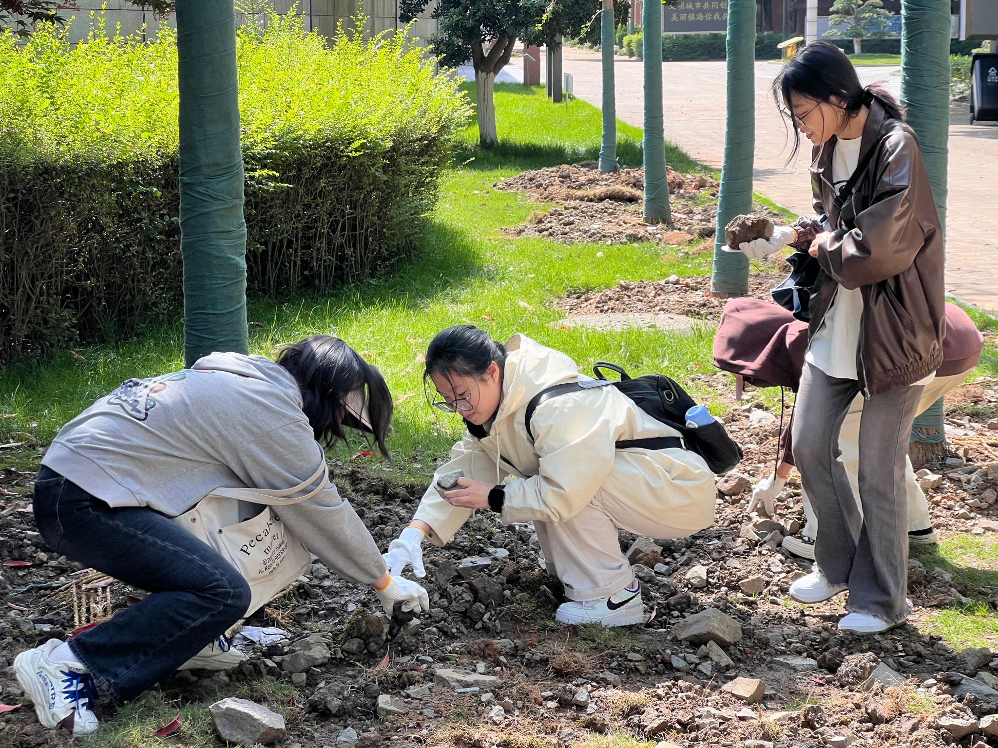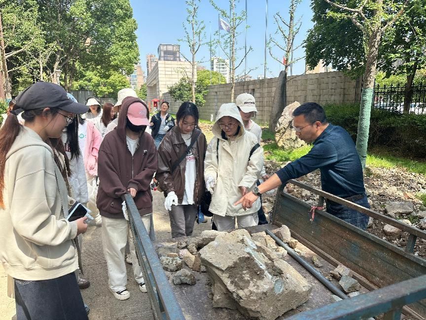 紧接着,同学们分散到指定区域,寻觅着颜色独特、类型奇异的石头。大家时而俯身仔细观察地面,时而相互交流分享发现。杜校长穿梭在同学们中间,结合现场捡到的石头,深入浅出地科普浙江岩石的相关知识。杜校长的讲解让同学们在动手实践的同时,对地质学知识有了更直观、更深入的认识。找完石头,大家又去挖小叶灌木树根,为盆景制作提供素材。