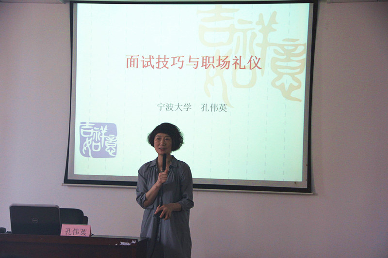 最后,孔老师又跟同学们分享了很多面试常见问题的巧妙回答,并对同学们现场提问一一解答。现场气氛热烈,同学们被孔老师自身优雅得体的礼仪和生动实用的讲座深深吸引。