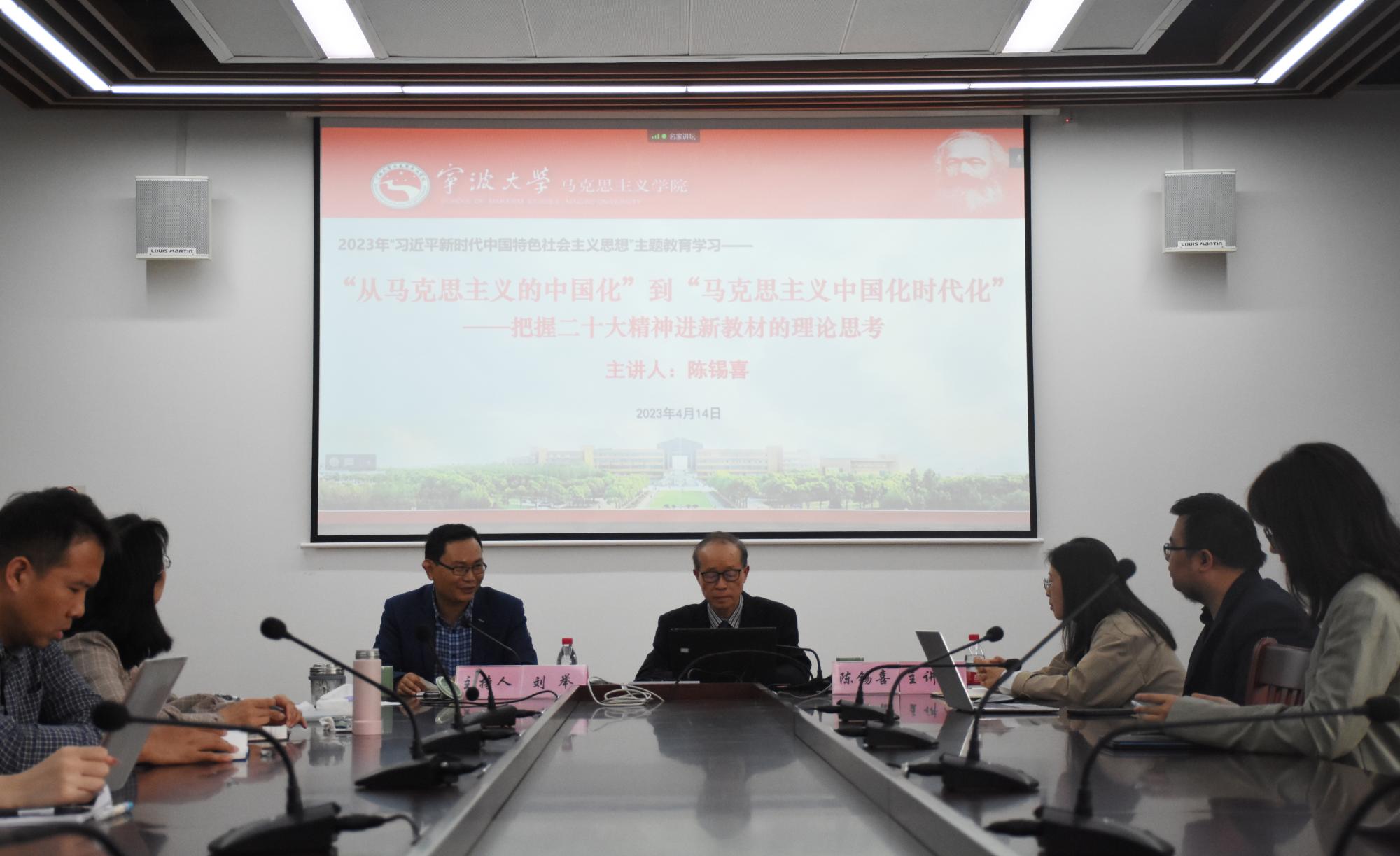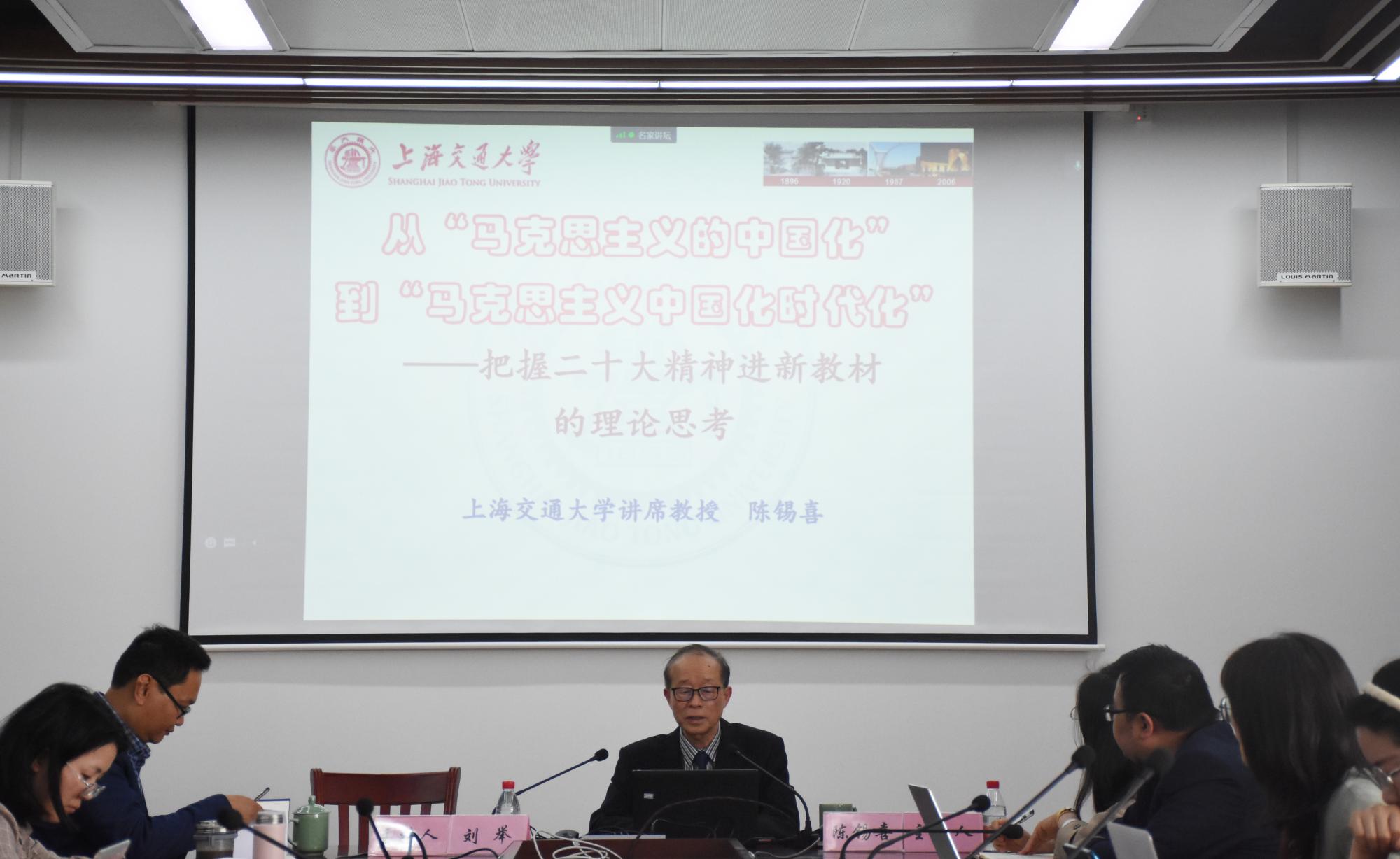 为深入开展学习贯彻习近平新时代中国特色社会主义思想主题教育,深化理论学习,积极推动主题教育走深走实。4月14日下午,在包玉书科技楼7号楼513会议室,上海交通大学博士生导师陈锡喜教授应邀以“从‘马克思主义的中国化’到‘马克思主义中国化时代化’——把握二十大精神进新教材的理论思考”为题,作校人文社科“名家讲坛”第344讲暨马克思主义银河娱乐网
