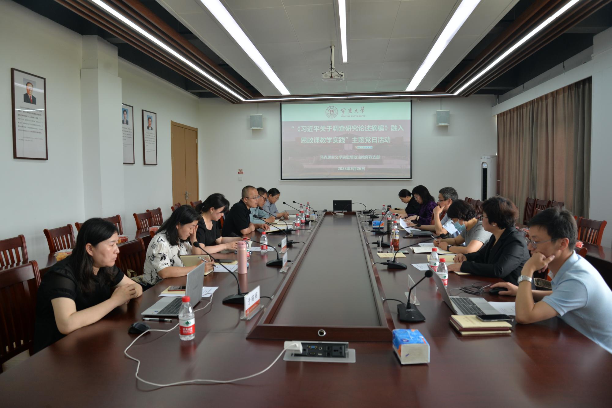 思想政治教育党支部的主题党日活动。本次活动以“《习近平关于调查研究论述摘编》融入思政课教学实践”为主题,会议由支部书记郑善庆主持,支部11名党员参加了会议。