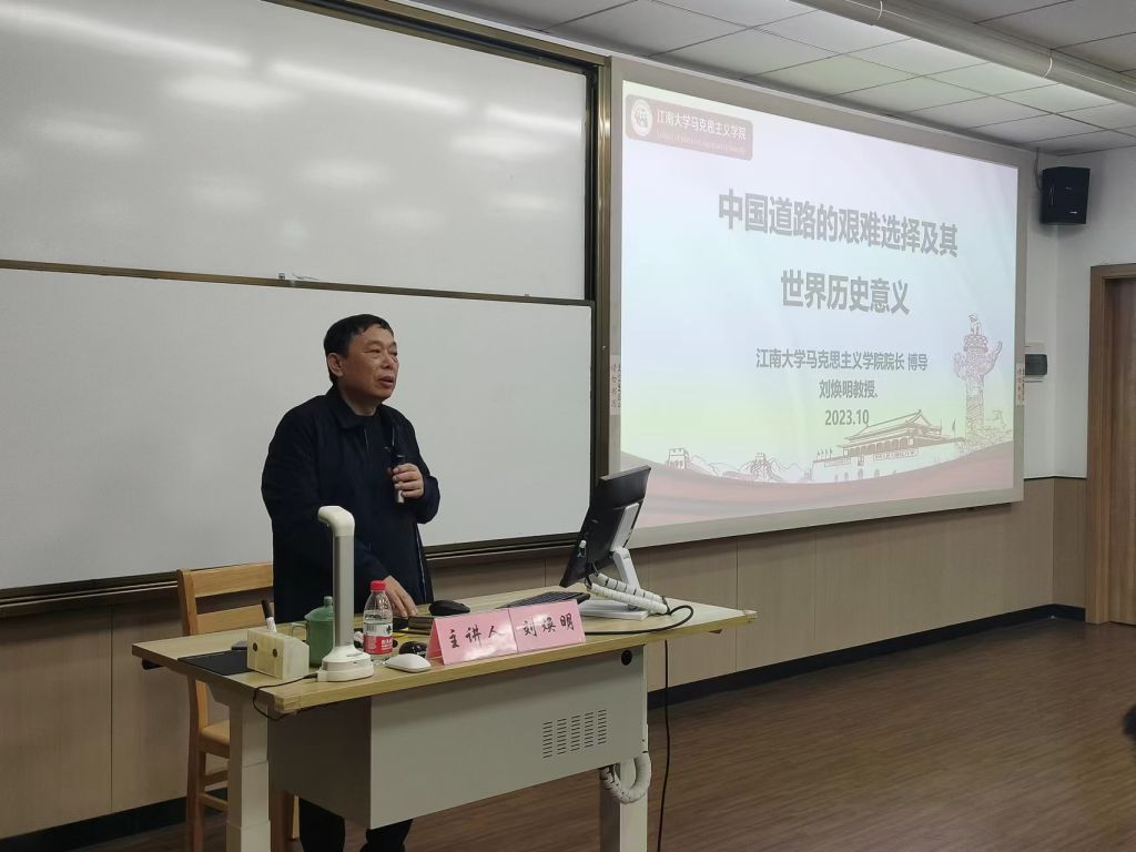 为进一步强化师生理论学习,坚定青年中国特色社会主义道路自信,10月25日晚,在包玉刚教学楼4号楼209会议室,江南大学马克思主义银河娱乐网 院长刘焕明教授以《中国道路的艰难选择及其世界历史意义》为主题,与宁大师生分享了他对中国道路的研究成果与深入见解。副院长刘举主持了本次讲座。