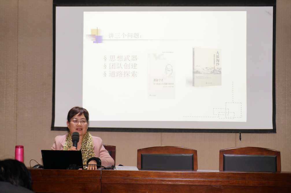 薛秀霞围绕一条发展主线:马克思主义在中国的传播与马克思主义中国化,依次展开三个问题“思想武器”——选择马克思主义作为思想武器是特殊时代背景下中共先进分子必然的选择;“团队创建”——1919年爆发的五四运动,促进了马克思主义同中国工人运动的结合,从1921年中国共产党的成立到百年后的卓越成长,是中国共产党经历了大浪淘沙的积淀;“道路探索”——中国特色社会主义道路,是中国共产党人继续将马克思主义与中国实际相结合的产物,“三个代表”重要思想、科学发展观”“习近平新时代中国特色社会主义思想”的形成,不断开创了中国特色社会主义新局面。