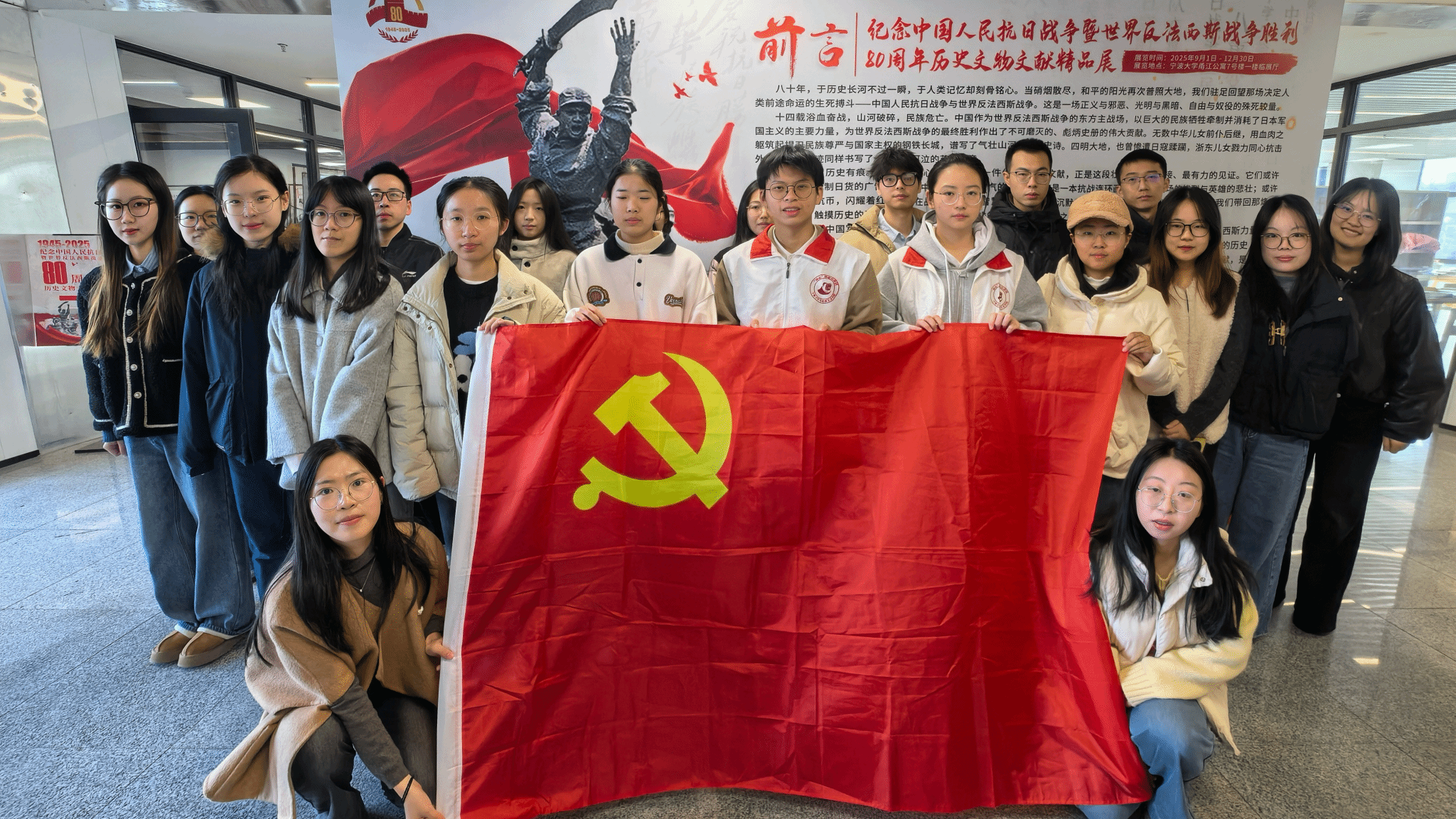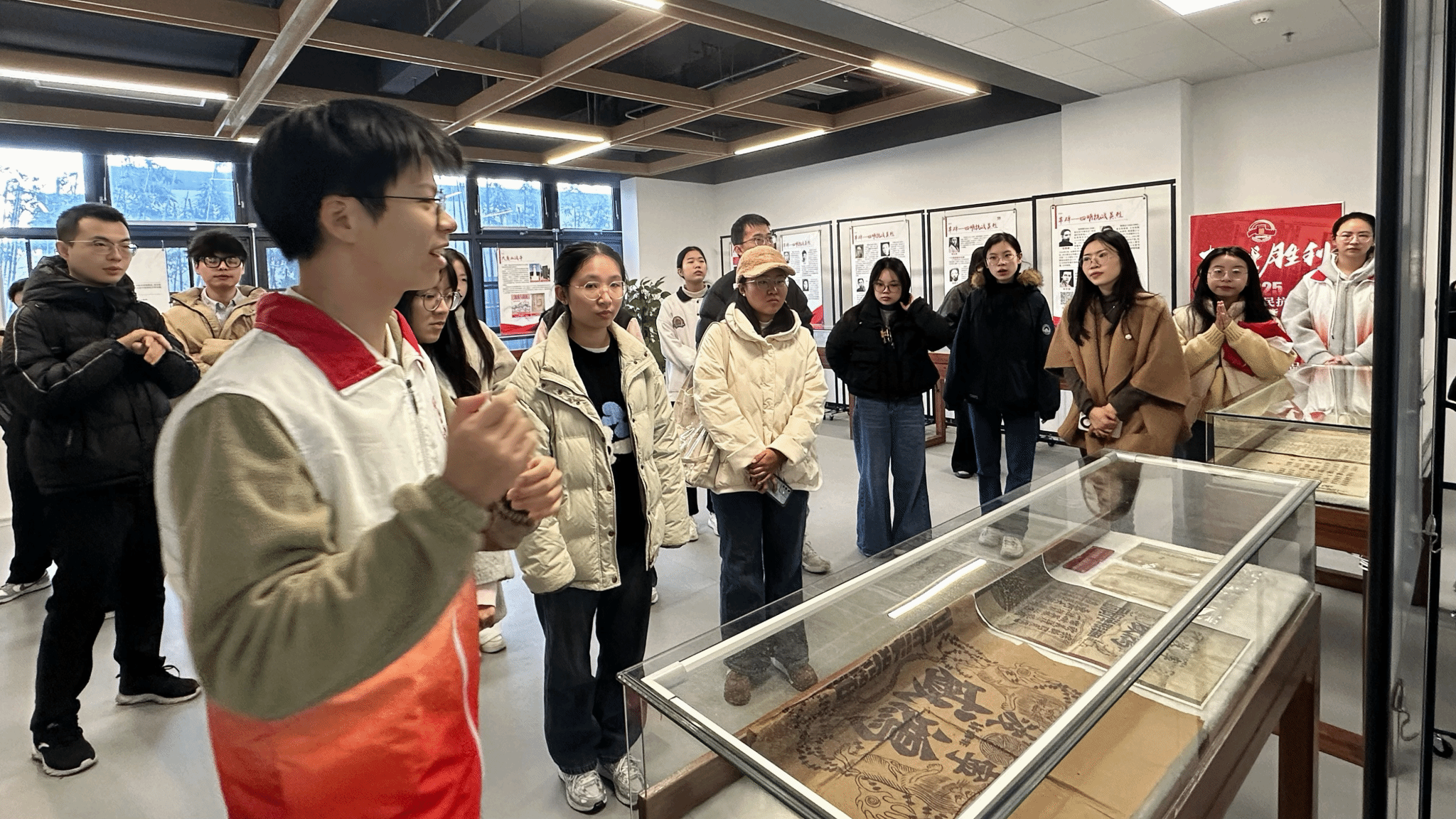 2025年11月28日上午,马克思主义中国化研究生党支部在甬江公寓7号楼精品展区开展十一月主题党日活动。本次活动以“红色行知录”为主题,融合历史寻访与理论研习,通过沉浸式观展与互动式研讨,引导党员在回望抗战历史中感悟精神力量、砥砺初心使命。